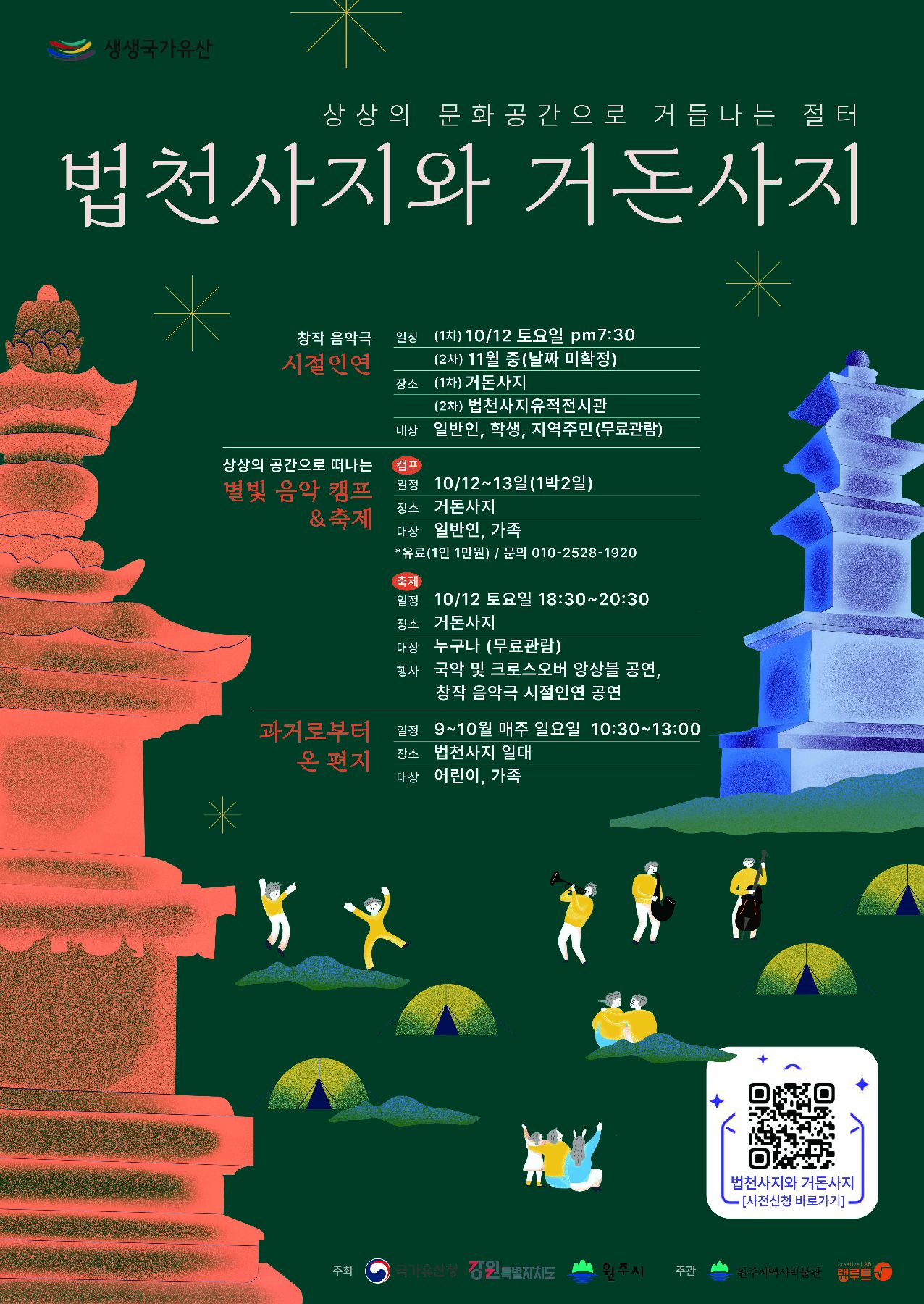 □ 상상의 문화공간으로 거듭나는 절터 ‘법천사지와 거돈사지’라는 주제로 진행되는 이번 사업은 옛 절터에서 펼쳐지는 음악공연과 감성캠핑, 스토리텔링을 통한 융복합 체험 등 특색있는 프로그램으로 구성됐다.